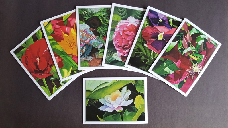 The Floral collection greeting card line will be available for purchase soon. The cards are 5″ x 7″, blank inside and come with matching white envelopes. There is a pic and blurb about Debra on the back of each card.